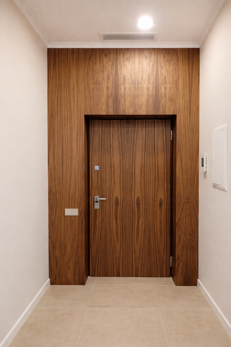 Когда дверь и откосы оформлены тем же материалом, что и декоративная стена, появляется эффект цельной поверхности. Дверь визуально «растворяется» в интерьере и становится частью архитектуры пространства.