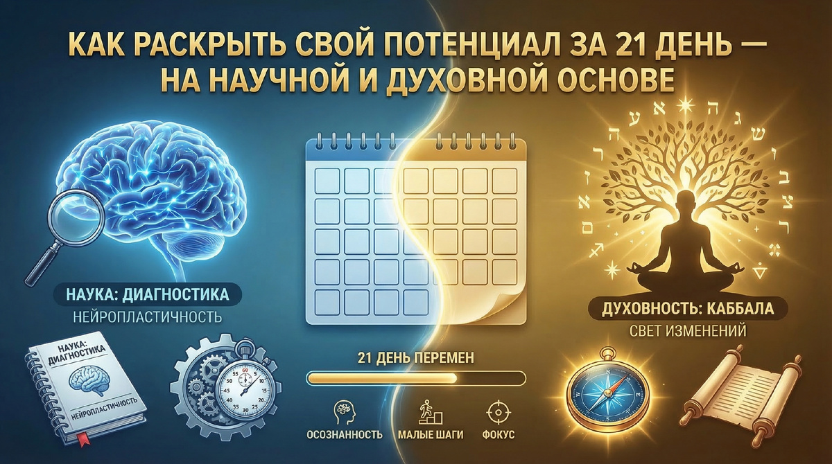 Здесь наука и древняя мудрость единодушны: наш мозг адаптируется к новым привычкам примерно за 3 недели. Это подтверждено нейропсихологами — формирование устойчивой нейронной связи, которая меняет поведение, занимает около 20-30 дней. В каббале тоже существует принцип «21 дня»: именно такой цикл завершает круг трансформации — от замысла до результата. Совпадение? Скорее, универсальный принцип природы.