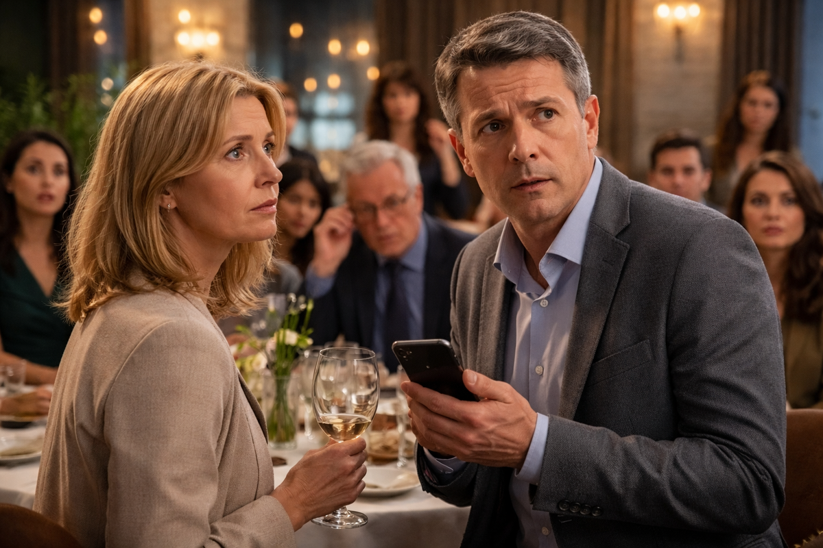 Кто-то за соседним столом нервно звякнул вилкой. За окном темнели сосны. В стекле отражались лица, жёлтые лампы, белые скатерти, и всё это выглядело так, будто вечер специально собрал красивую обстановку для чужого позора.