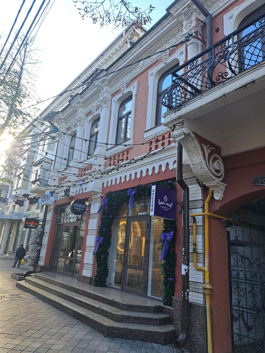 Дом купцов Тарасовых по Красной, 79 в начале 20-го века считался одним из самым дорогим в городе. Это и неудивительно, учитывая его размеры. Дом был богато декорирован внутри: альфрейные росписи, лепнина, шикарные изразцовые печи. Что-то сохранилось до наших дней. После революции здание было национализировано, в советские годы в нём размещалась Краснодарская военная комендатура. Кому сейчас принадлежит здание дома Тарасовых – неизвестно. Если заглянуть в окна видно, что сегодня внутри помещение в разрухе и запустении.