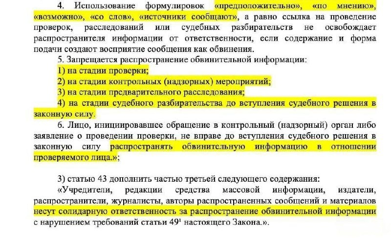 Госсовет Татарстана внес в Госдуму проект законодательной инициативы об ограничении распространения в СМИ обвинительной информации до вступления судебного решения в силу. В случае принятия документа журналистам будет запрещено публиковать сообщения, которые создают у аудитории впечатление о виновности конкретного человека или компании. Информация будет считаться обвинительной даже при использовании формулировок «предположительно», «по мнению», «возможно», «со слов», «источники сообщают», если сообщение воспринимается как обвинение. Авторы проекта ссылаются на 49-ю статью Конституции, согласно которой обвиняемый считается невиновным до вступления приговора суда в законную силу. Изменения предлагается внести в закон «О средствах массовой информации». Ответственность за публикацию будут нести учредители СМИ, редакции, издатели, журналисты. Предусмотрены серьезные штрафы. Да запретите уже нам вообще писать о чем угодно, кроме роста надоев. И будет счастье.
