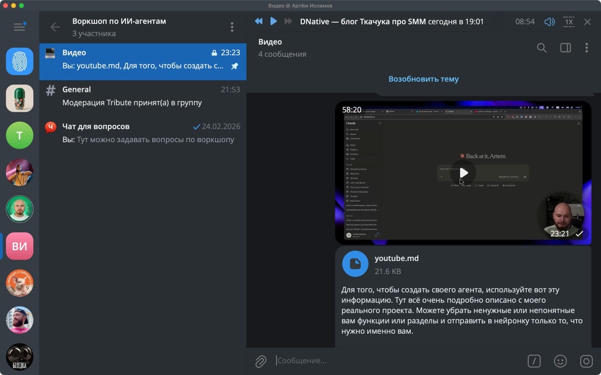 🙌 Уже давненько я записал вот это видео: https://youtu.be/8YxN9egy994 хотел объяснить, почему я плачу за Claude 100 баксов в месяц, а сам случайно попал в большую боль Ютуберов. Я показал своего ИИ-агента, который забрал у меня рутину по ютубу. И у меня взорвалась личка. Люди просили, чтобы я им показал как настроить такого ИИ-агента, который: — придумывает название видео — составляет описание видео — рисует обложку видео — делает субтитры и перевод — сам публикует видео на ютубе — перепубликует в ВК и так далее Я на таких консультациях заработал много деняк. Даже Дима Портнягин приходил учиться, чтобы делать всякое. Много людей в комментариях просили организовать воркшоп — практическое занятие. А у меня прям были заняты руки. И вот теперь руки дошли. Сегодня сел и записал ВЕСЬ процесс создания такого ИИ-агента с нуля. Причем так, чтобы потом его можно было докрутить и расширить под свои специфичные задачи. То есть даю не рыбу, а удочку и все дела. В общем, приходите делать ИИ-а
