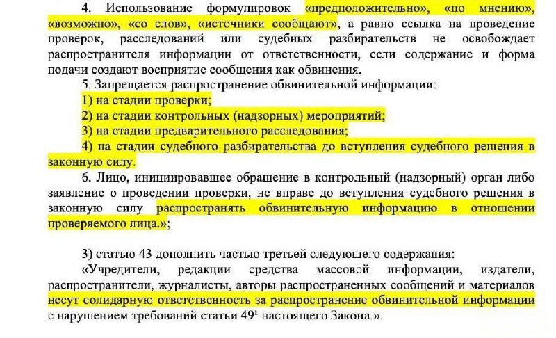 Документ запрещает использовать выражения «предположительно», «по мнению», «источники сообщают» без решения суда. Такие формулировки часто применяются в журналистских расследованиях о коррупции, злоупотреблениях властью и незаконных действиях чиновников. За нарушение предусмотрен крупный штраф - до двух миллионов рублей. Однако Конституция РФ гарантирует свободу слова и массовой информации, а также прямо запрещает цензуру.