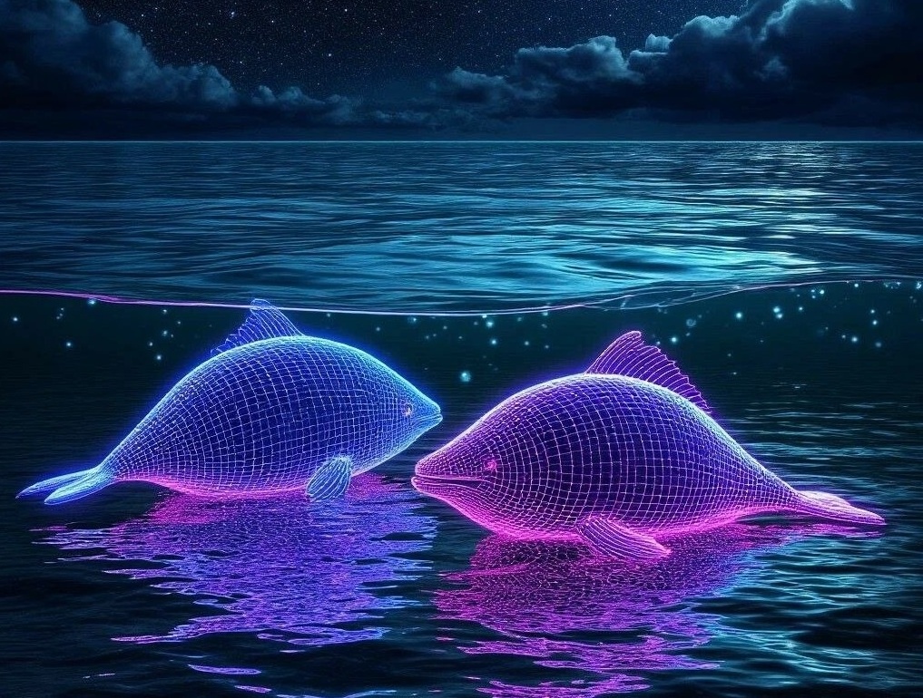 - Хватит уже высовываться. Заметит кто-нибудь. - Сказала ему Арайя своим привычным приказным тоном, но он, не обратив внимания на её слова, раздвинул листву и перед его глазами предстала картина удивительной красоты. Море сияло так, словно на нем расположились мириады звёзд. А ещё на его поверхности он увидел двух очень крупных животных, светящихся неоновым светом. Одно из них подняло кверху голову и, открыв свою огромную пасть, издало громкий рев.