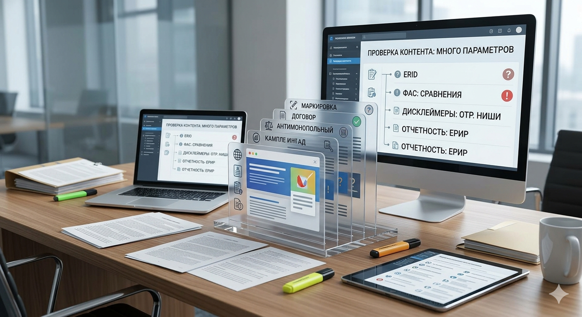Многие ошибочно полагают, что для соблюдения закона достаточно просто зарегистрировать рекламу в ОРД и получить токен. На практике комплексная проверка законности рекламного контента включает в себя огромное количество строгих параметров.