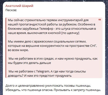 Вы его про..бываете! Вам бы ногу вставлять в каждую приоткрытую дверь. А вы их (двери) захлопываете и отворачиваетесь в позе обиженки. А в ногу - стреляете. Вы свой телерупор мирового (без дураков) уровня - Russia Today, по сути, слили в унитаз. Потому что вас, видите ли, запретили к трансляции! Просто взяли и запретили к трансляции страну с тремя космодромами! У вас через год уже должны были висеть на геостационаре 4 спутника, которые в совершенно свободном режиме, без кодирования, без подписки и смс, с правом свободной ретрансляции должны на весь мир гнать весь тот многоязычный контент, который выдавал RT. Туда же еще и Sputnik потом, разумеется, присовокупить. Только нести надо реально правдивую и объективную информацию. За что RT в свое время в мире сильно уважали. Есть мнение, что выгнуть ситуёвину в свою пользу было бы сильно проще. Букв нет, просто. ДБ! 🐶 Подпишись на Шарика! Гав!