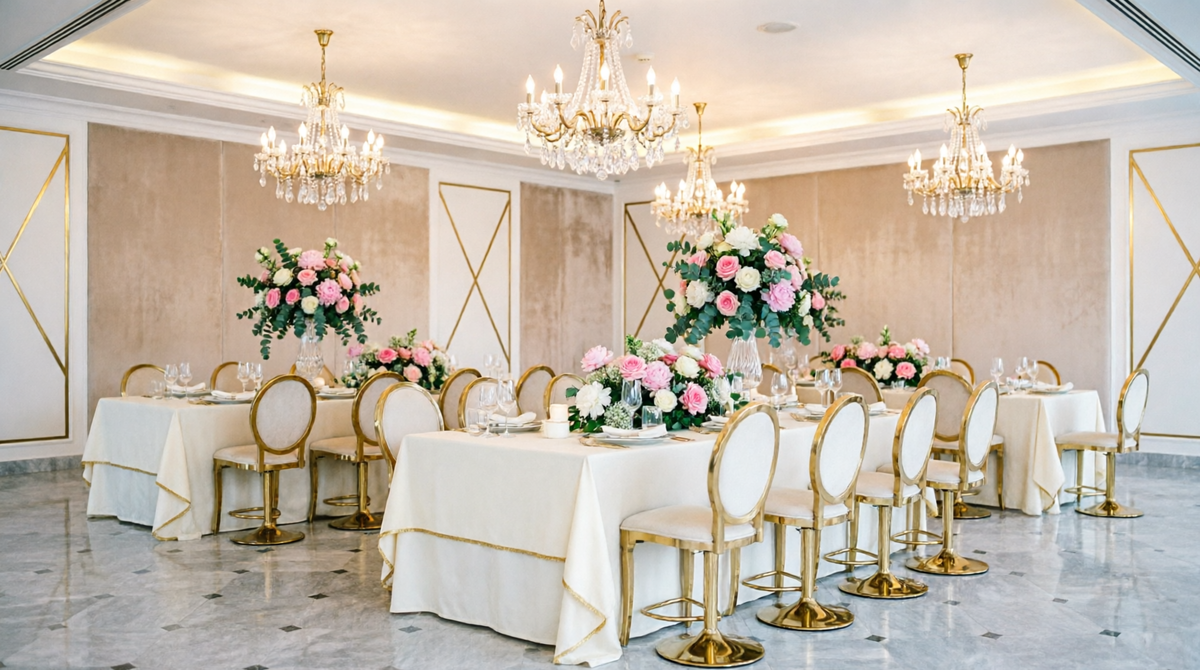 - 🍽️ Банкет и площадка: 40–45%. Самая весомая статья расходов. Включает аренду зала, меню на одного гостя, алкогольную карту и сервисное обслуживание.
