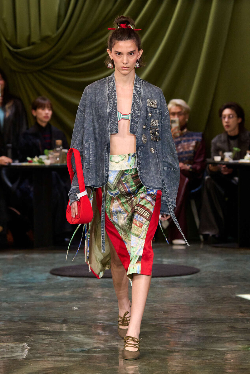После некоторых показов остаётся только красивая картинка. А после Hui весна–лето 2026 хочется смотреть именно на детали — потому что многие из них вполне можно адаптировать для жизни. Коллекция, показанная на Неделе моды в Милане, строится на очень выразительном сочетании: традиционные мотивы, мягкая женственность и современная носибельность. И именно детали здесь делают всё. Вышивка, серебряные акценты, прозрачные слои, драпировка, деним, красные аксессуары, фактурные ткани — всё это не выглядит случайным декором, а работает как характер образа. Самое полезное в этой коллекции — несколько приёмов, которые легко взять себе на заметку. Во-первых, деним с вышивкой или заметной фактурой: он сразу выглядит интереснее обычного и не требует сложного верха. Во-вторых, прозрачный слой поверх более спокойной базы — это делает образ легче и глубже, но не перегружает его. В-третьих, яркий акцент в обуви или сумке: красный здесь буквально собирает образ и даёт ему энергию. И ещё один важный ход —