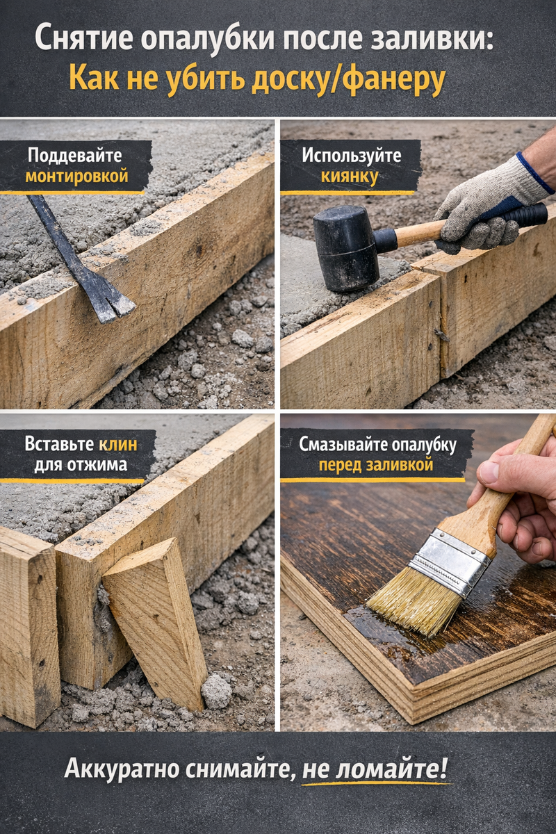 Снимать опалубку надо не по нервам, а по состоянию бетона. Разбирать — без рывков и без удара по кромке. Материал — сразу чистить и складывать как инвентарь, а не как мусор. Тогда и бетон останется целее, и доска с фанерой ещё отработают.