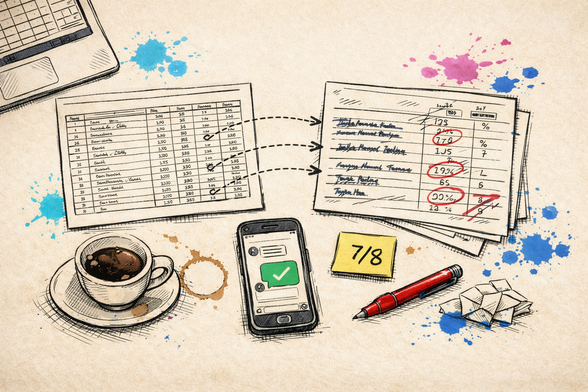Каждую неделю я получала отчёты от партнёров: что продали, что осталось на складе. У каждого партнёра — свой формат, свои названия товаров, свой бардак. Мне нужно было свести всё в одну таблицу. Руками. Каждую неделю. Решила проверить: справится ли нейросеть? Загрузила файлы, написала задачу. Почти справилась. И вот это «почти» оказалось самым интересным. У нас в системе товар называется «Подставка для ноутбука алюминиевая». Один партнёр пишет «Подставка для ноутб. алюм.». Второй — «Ноутбук-подставка (алюминий)». Третий может написать «столик для ноута». Это один и тот же товар. Но попробуйте объяснить это Excel-формуле. Если названия совпадают точно — VLOOKUP подтянет нужный код. Но когда каждый партнёр пишет по-своему, точного совпадения нет. Приходится сопоставлять глазами: это, похоже, то же самое... а вот это? Тоже? И так по каждой позиции. Иногда у партнёра в системе уже стоит наш код — тогда проблемы нет. Но так бывает далеко не всегда. Загрузила в нейросеть три файла: отчёт от
