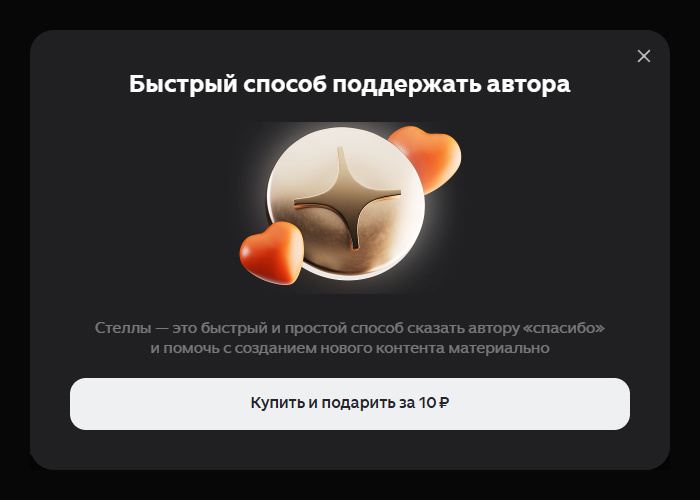 Читатели могут купить Стеллы и дарить их под понравившимися статьями. Автор получает дополнительный доход, помимо стандартной монетизации за просмотры.