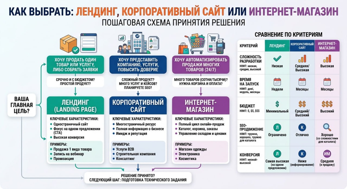Как выбрать: лендинг, корпоративный сайт или интернет‑магазин