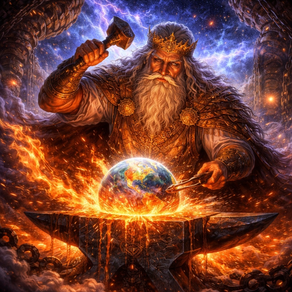 То есть его творение — это не просто “материал мира”, а его устроенность. И в этом смысле небесный кузнец не ниже творца. Он и есть творец — только не книжный, а ремесленно-космический.
