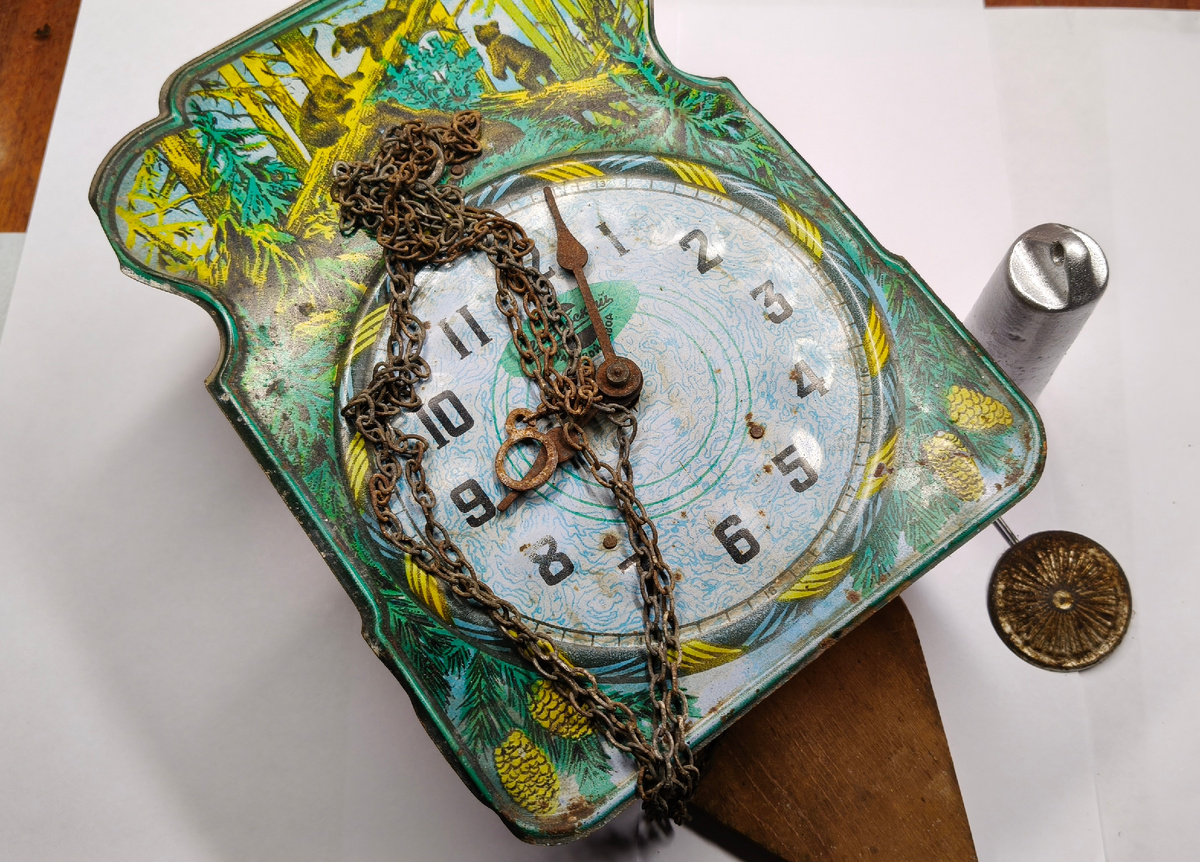 Доброго времени суток! В ремонте часы ходики, даже не знаю какого года выпуска. Часы очень атмосферные, почему сейчас такие не делают??? Часы не идут, по состоянию стрелок и корпуса предполагаю, что лежали в сыром чулане. Боковые стенки корпуса стеклянные!!! Корпус часов выполнен из настоящего дерева! Что бы добраться до механизма нужно оторвать переднюю часть - она прибита гвоздями к корпусу. Боковые стёкла вставлены в прорези на корпусе.. Механизм конечно немного заржавел, но думаю что получится его реанимировать. Разбираю полностью механизм и все детали помещаю в бензин. Кстати, скоба почти без следов выработки, как новая. Механизм собрал и установил в корпус, всю ржавчину так и не получилось отчистить. Цапфы смазал часовым маслом. Выработки в цапфах практически нет. Немного были погнуты платины - уменьшил зазор с помощью грубой силы и плоскогубцев. Подвес был короткий, часы сильно отставали, поэтому сделал свой из медной проволоки диаметр около 1,5 мм. подлиннее. Боковые стёкла отм