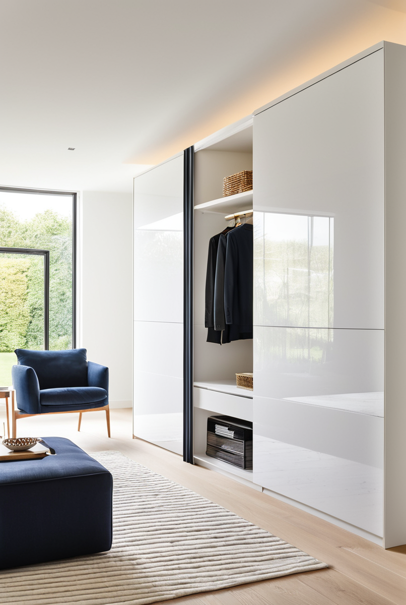 - Какой шкаф лучше для маленькой гостиной: шкаф-купе или распашной шкаф?Для компактных комнат однозначно выигрывает шкаф-купе. Его раздвижные двери не требуют свободного места для открытия. Чтобы визуально расширить пространство, выбирайте зеркальный или глянцевый фасады. Идеальное решение — встроенный белый шкаф в нишу или до потолка, который буквально сливается с окружением. Распашной шкаф больше подходит для просторных гостиных в классический стиле, где он выступает как самостоятельный предмет мебели. Светлые оттенки всегда делают любой шкаф визуально легче.