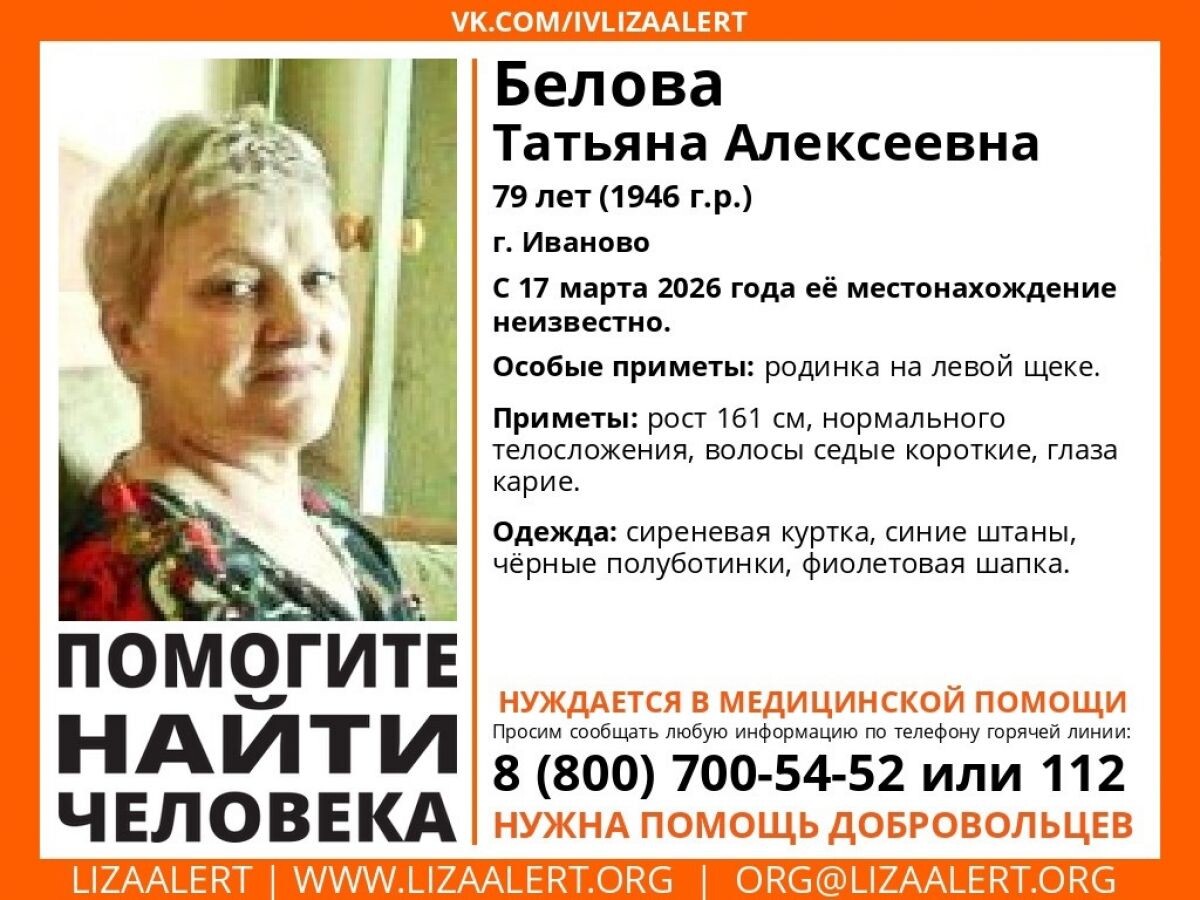 В Иванове пропала 79-летняя Татьяна Белова. По информации поискового отряда «ЛизаАлерт», её местонахождение неизвестно с 17 марта. Бабушке нужна медицинская помощь. Её рост 161 см, нормальное телосложение, седые короткие волосы, карие глаза. Была одета в сиреневую куртку, синие штаны, чёрные полуботинки и фиолетовую шапку. У бабушки есть родинка на левой щеке. Любую информацию о её местонахождении просят сообщить по телефону 8 (800) 700-54-52 или 112.