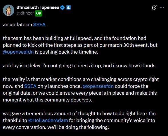 CEO OpenSea вышел с большим апдейтом по планам проекта. ▪️ Команда планировала начать запуск токена уже в конце марта, но решила перенести сроки. Причина — слабый рынок. ▪️ Кампания по фарму заканчивается, больше волн не будет. Участники смогут вернуть комиссионные за 3-6 волны. ▪️ Также накинули приятный бонус, а именно 0% комиссий на 60 дней, с 31 марта. Ничего удивительного. Проектам тоже нужен хороший рынок, иначе дорого выйти не получится 😉 🆙 Upscale – трейдинг, доступный каждому Первый челлендж Скидка 5%