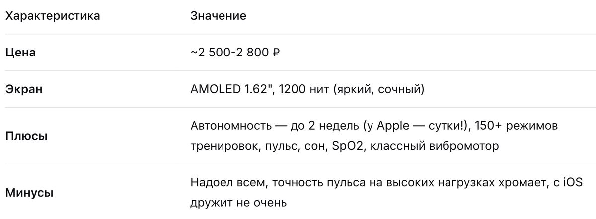 Мой вердикт: Это идеальный выбор для 90% людей. Он делает то же, что и Apple Watch, но не требует ежедневной подзарядки и не разоряет бюджет. Если ты хочешь просто считать шаги, пульс и смотреть уведомления — бери, не думай.