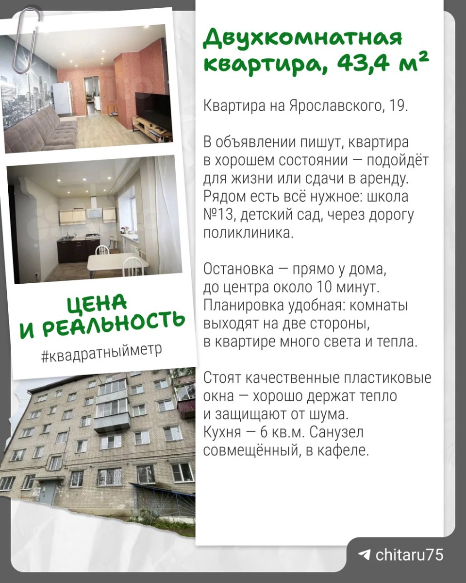 Стоимость такой квартиры на Ярославского 5 150 000 рублей или 118 664 рублей за квадратный метр. Квартира подойдёт и для себя, и как инвестиция под аренду. Рядом с домом есть открытая парковка, жильцы отмечают хорошую инфраструктуру, но иногда бывают проблемы с УК. Жили бы в такой? 👍🏻/👎🏻 #квадратныйметр