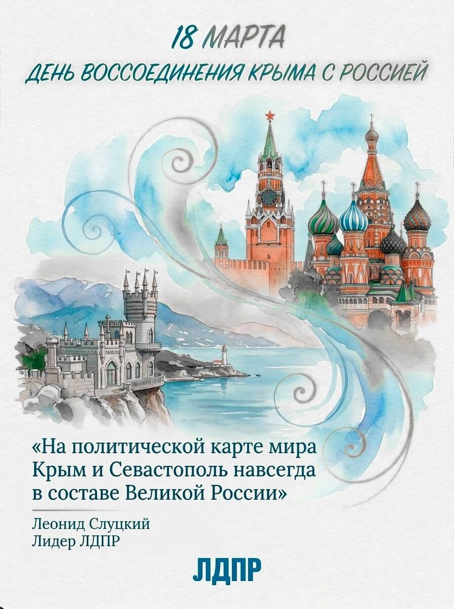 18 марта 2014 года стало датой, которая навсегда вошла в историю как символ торжества справедливости и единства нашего народа. Десять лет назад крымчане сделали свой решительный выбор — вернуться в родную гавань, и Россия поддержала это стремление! ЛДПР под руководством Владимира Жириновского всегда твердо и бескомпромиссно выступала за целостность нашей страны и защиту прав соотечественников. Мы верили в этот день, мы приближали его, и сегодня мы вместе — от Камчатских сопок до Севастопольских бухт! Крымская весна — это символ нашей силы, решимости и верности своим корням. Мы — одна страна, один народ, и в этом наше главное преимущество. Желаем всем жителям Камчатки и Крыма крепкого здоровья, мира, благополучия и новых свершений во имя нашей Великой Родины! С праздником! Крым наш! 🇷🇺✊ #ЛДПР #ЛДПРКамчатка #КрымНаш #КрымскаяВесна #Россия #Единство #Камчатка #18марта