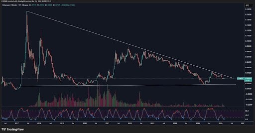 Криптоаналитик CW выявил 8-летний паттерн конвергенции на графике ETH/BTC, который может стать катализатором альтсезона, превосходящего по силе 2021 год. Несмотря на то что слухи об альтсезоне циркулируют с 2025 года, фактической реализации не произошло, а волатильность альтернативных криптовалют сохранялась. Формирующийся паттерн конвергенции вселяет надежду на значительный сдвиг. 📊 Ключевые моменты: - Паттерн конвергенции ETH/BTC формировался с середины 2017 года в виде нисходящего треугольника/клина. - Цена ETH/BTC достигла пика около 0.16 в 2021 году, но не смогла пробить верхнюю линию сопротивления. - Текущая цена ETH/BTC — около 0.029, что находится вблизи самой вершины паттерна конвергенции. - Прорыв из этой точки может сигнализировать о переходе силы от BTC к ETH и, наконец, к более широкому рынку альткойнов.