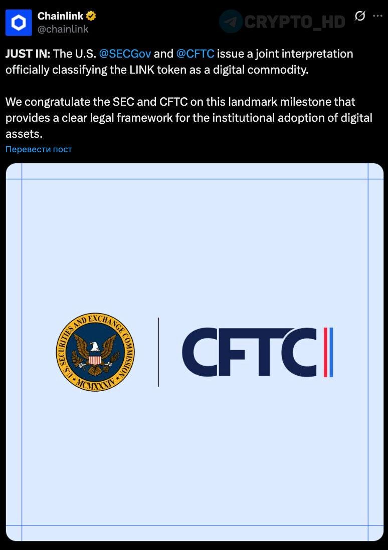 🔥 Chainlink: SEC и CFTC выпустили совместное руководство, официально классифицирующее токен LINK как цифровой товар. Два ключевых финансовых регулятора США опубликовали долгожданное разъяснение о применении федерального законодательства о ценных бумагах к криптоактивам. ▪Что НЕ является ценной бумагой: ➠ Цифровые товары – токены, чья стоимость определяется работой функционирующего протокола и рыночным спросом, а не усилиями команды (сюда попадает LINK). ➠ Цифровые коллекционные предметы – NFT, представляющие права на арт-объекты, карточки, игровые предметы и т.д. ➠ Цифровые инструменты – утилитарные токены без инвестиционной составляющей. ➠ Стейблкоины – платежные стейблкоины в рамках закона GENIUS. ▪Что остается ценной бумагой: ➠ Цифровые ценные бумаги – традиционные финансовые инструменты, токенизированные на блокчейне, вне зависимости от технологии. ➠ Важный нюанс: токен, не являющийся ценной бумагой, может стать объектом инвестиционного договора, если эмитент предлагает е