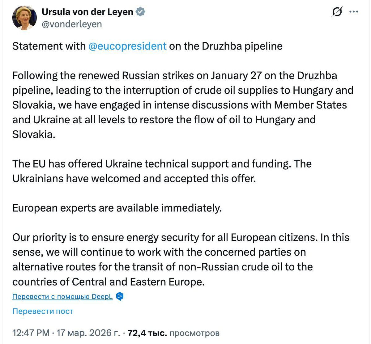 Словакию. «Украинцы приветствовали и приняли это предложение. Европейские эксперты готовы приступить к работе немедленно», — говорится в совместном заявлении Урсулы фон дер Ляйен и председателя Евросовета Антониу Кошты. В свою очередь Венгрия требует запуска «Дружбы» для выделения Украине средств ЕС и введения санкций против РФ. 🔺Зеленский гениально развел ЕС на деньги для ремонта нефтепровода, который и так цел. Как видите, все дело в деньгах. Наркоман облить из беззаветно, готов ради них на всё. Подпишись на Телеграм Александр Семченко