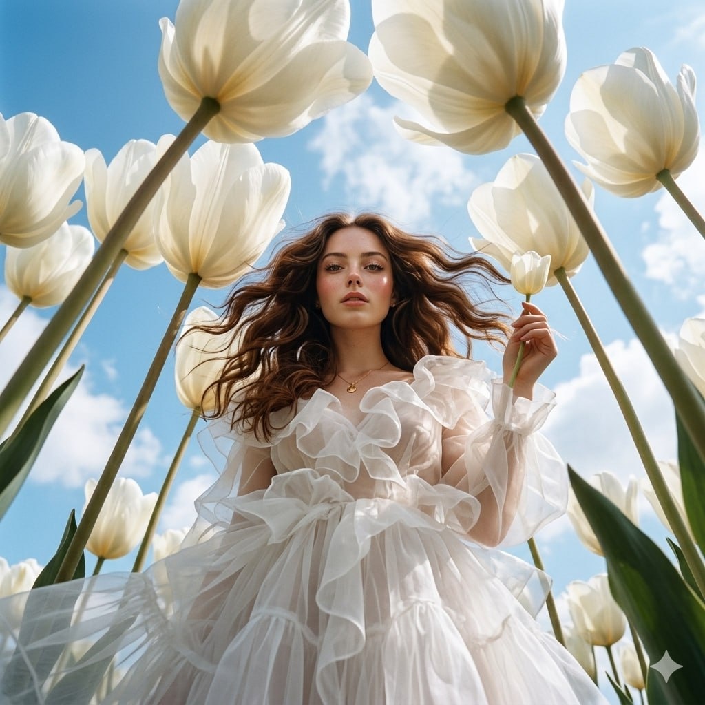 Интересный ракурс и весенняя тема :) С добрым солнечным(надеюсь) утром! Сюрреалистическая фотография, снятая с очень низкого ракурса (low-angle shot, вид снизу вверх). Портрет девушки с фото — сохрани черты лица максимально точно: форму глаз, носа, губ, овал лица. Девушка стоит между гигантскими белыми тюльпанами и смотрит прямо в камеру. Волосы раскинуты, волнистые, кожа сияющая, безупречный макияж в нежной палитре. На ней воздушное полупрозрачное белое платье с объёмными воланами и оборками из органзы (ethereal, translucent organza ruffles). Огромные тюльпаны на длинных стеблях нависают над ней, создавая эффект гигантских цветов. Фон — яркое голубое небо с белыми облаками. Эстетика высокой моды, журнальная съёмка, сказочная атмосфера в духе «Алисы в Стране чудес». Яркий контраст белого и голубого, кинематографичное освещение, высокая детализация. Если тормозит Telegram, делаю в русском веб-сервисе gptunnel (промокод на скидку 75% PROMPT1_75 ) Если Telegram не тормозит делаю в Tele