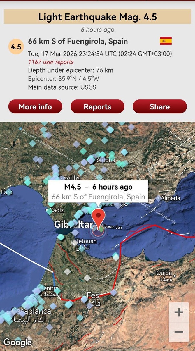ОСТИ перед ощутимым землетрясением в Гибралтаре наблюдались 15-16 марта (фото 2-5)