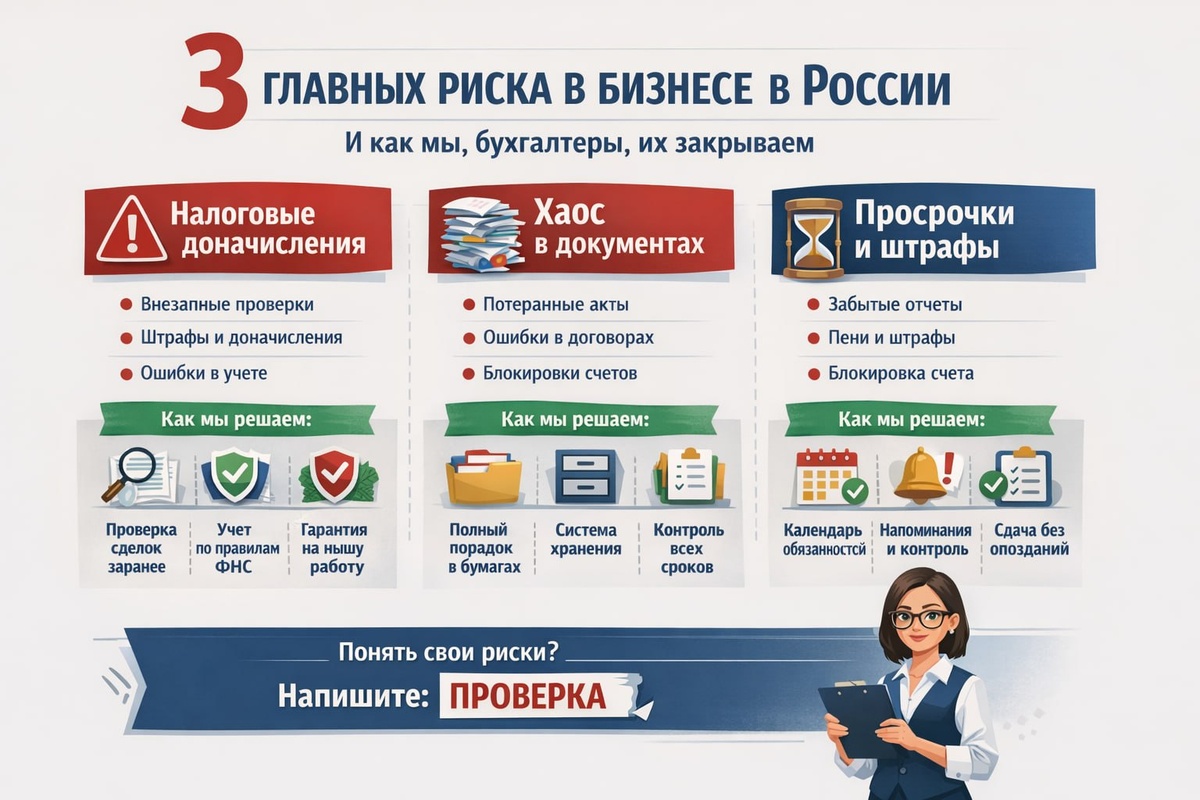 😎Если коротко — бизнес в России сейчас не “про продажи”. Он про выживание без штрафов, блокировок и сюрпризов от налоговой. Вот 3 риска, которые я вижу каждый день 👇 ❌ 1. Налоговые риски и доначисления Самый частый сценарий: всё вроде платили → потом приходит проверка → +500 000 ₽ к уплате Почему так происходит: — учет “на глаз” — бухгалтер не видит риски заранее — ВЭД вообще ведется “как получится” 👉 Как мы закрываем: — проверяем сделки ДО того, как станет поздно — выстраиваем учет под реальную практику ФНС — даем гарантию на свою работу ❌ 2. Бардак в документах Классика: договор есть → акта нет платеж есть → назначения не бьются по ВЭД — вообще “где-то в почте” 👉 Итог: — блокировки счетов — проблемы с банком — невозможность доказать расходы 👉 Как мы закрываем: — собираем систему документов по каждой сделке — делаем структуру хранения — ставим контроль: что, когда и кто должен предоставить ❌ 3. Просрочки и забытые отчеты “Мы не знали”, “нам не сказали”, “бухгалтер не у
