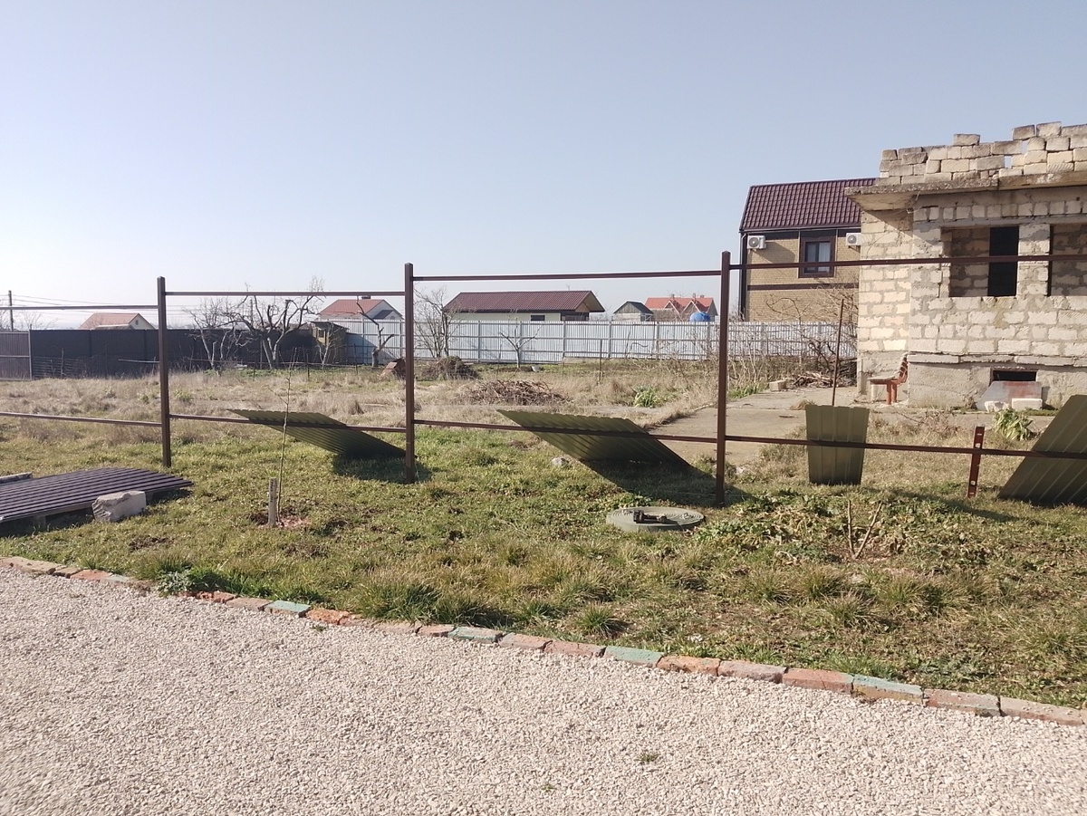 Здравствуйте наше вам! Погодка стоит изумительная, сосед помог сделать обрезку винограда, так что приводим участки в порядок, земля подсохла, травка зеленая, газонокосилка уже пошла в ход. Ну а мы, пока образовалась не большая передышка взялись за дела не долгие. Здесь делали фасад забора, потом, заказчик сам, пока здесь был, сделал профиля и столбы на боковой забор, попросил прикрутить профлист. Времени много не займет, тем более есть свободное. Так что прикрутили. Спрашиваю, а зачем перемычки внутри, а говорит, что бы у врагов снаружи лестницы не было. Сомнительно, кто в здравом уме по такой лестнице полезет на участок, при том что о верхний край профлиста изрежешься в любом случае. Попасть на участок с той стороны, шесть саморезов, ключиком на восемь и не нужна никакая лестница. Саморезы то как раз закручены со стороны соседей. Вот так вот логика действует. Сам сколько раз читал, в интернете, и про лестницу и про то, что нужно вместо одних саморезов, использовать разные. Пр