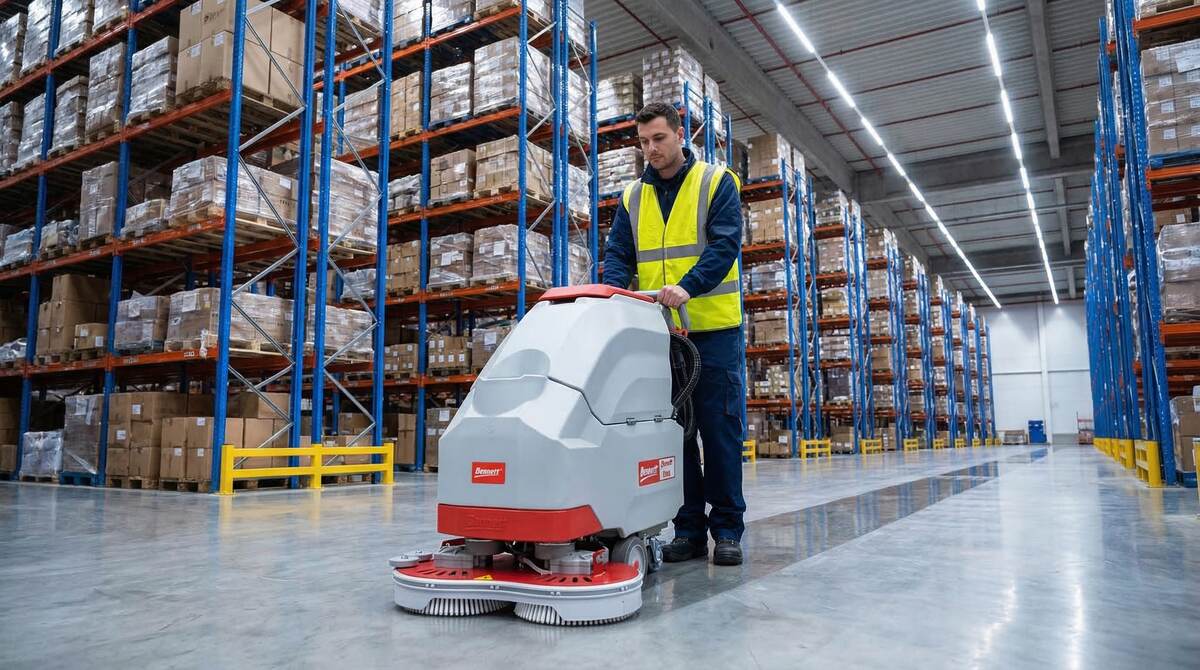 Склад — место, где грязь накапливается быстро: пыль с поддонов, следы от шин погрузчиков, масляные пятна. Ручная уборка отнимает часы и даёт посредственный результат. Профессиональная поломоечная машина решает эту задачу за 30–40 минут. ─── Шаг 1. Площадь и планировка склада 📌 До 1000 м² — компактные машины с шириной уборки 50–55 см 📌 1000–7000 м² — оптимальна ширина 66 см, производительность 2500+ м²/ч 📌 7000+ м² — сидячие машины (Hussar/Patrol) ─── Шаг 2. Тип покрытия и загрязнений 🔹 Бетон — нужен высокий прижим щётки (40+ кг). Bennett C660BT: 40 кг 🔹 Полимерное покрытие — важна ширина водосборной балки. C660BT: 900 мм 🔹 Плитка — дисковые щётки хорошо проходят по швам 🔹 Масло + пыль + песок — нужна двойная защита турбины (есть у C660BT) ─── Шаг 3. Аккумулятор или сеть Сетевые — работают непрерывно, но кабель ограничивает радиус. Подходят для небольших складов. Аккумуляторные — полная свобода. Для склада от 1000 м² это практически единственный разумный вариант. Bennett Clever C