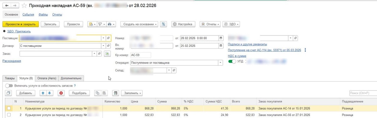 📦 Если бизнес пользуется курьерскими услугами или услугами почты по доставке товара до покупателя, то в 1С УНФ можно отразить эти операции через специальную операцию. Рассказываю. 1️⃣ Отражаем Заказ покупателя и Расходную накладную по продаже товара покупателю. В программе образуется долг покупателя перед бизнесом. 2️⃣После доставки мы получаем деньги на расчетный счет (р/с) от курьерской службы или почты. В документе "Поступление на р/с" нужно выбрать операцию "От курьерской компании или почты". Нужно будет указать заказы и суммы продажи и суммы комиссии курьерам (это можно посмотреть в отчете курьерской службы). При проведении этого документа 1С УНФ сама сформирует проводки по гашению долга покупателей и оплате комиссии курьерской службы. 3️⃣В этом же документе (поступление на р/с) нажимаем Создать на основании - Приходная накладная. Программа автоматически создаст Приходную накладную на комиссию курьерской службы. Нужно только у номенклатуры-услуги указать соответствующий счет