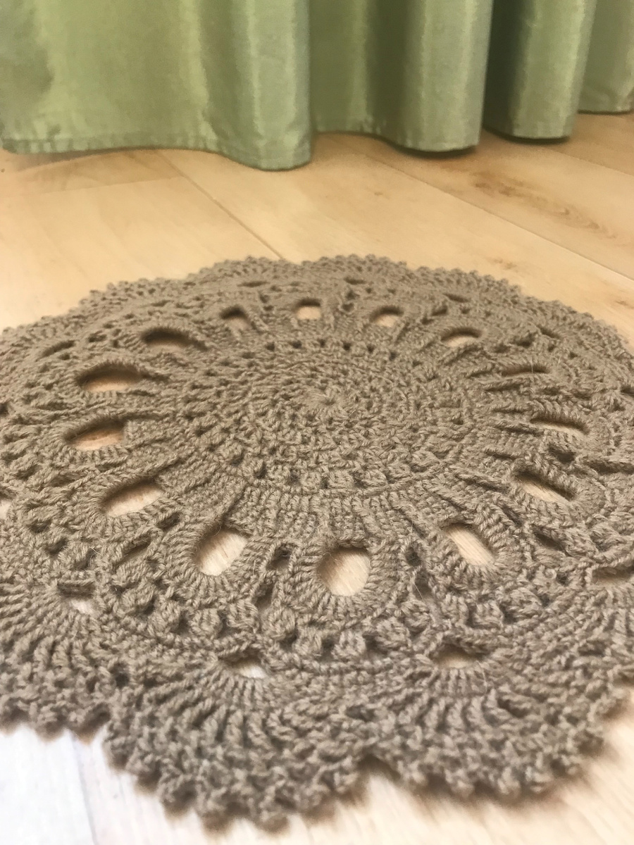 Как-то достались мне по случаю нитки узбекского коврового комбината, Шерсть 100%. Большая бобина зеленых и маленькая коричневых. Прям щедрый подарок! Зеленый продался давно через Ярмарку мастеров. Из коричневых ниток получился попроще, без рельефных элементов, т.к ниток мало было. Все равно красавчик! Постирала аккуратно, отпарила. Буду надеяться, что порадует кого-нибудь)))