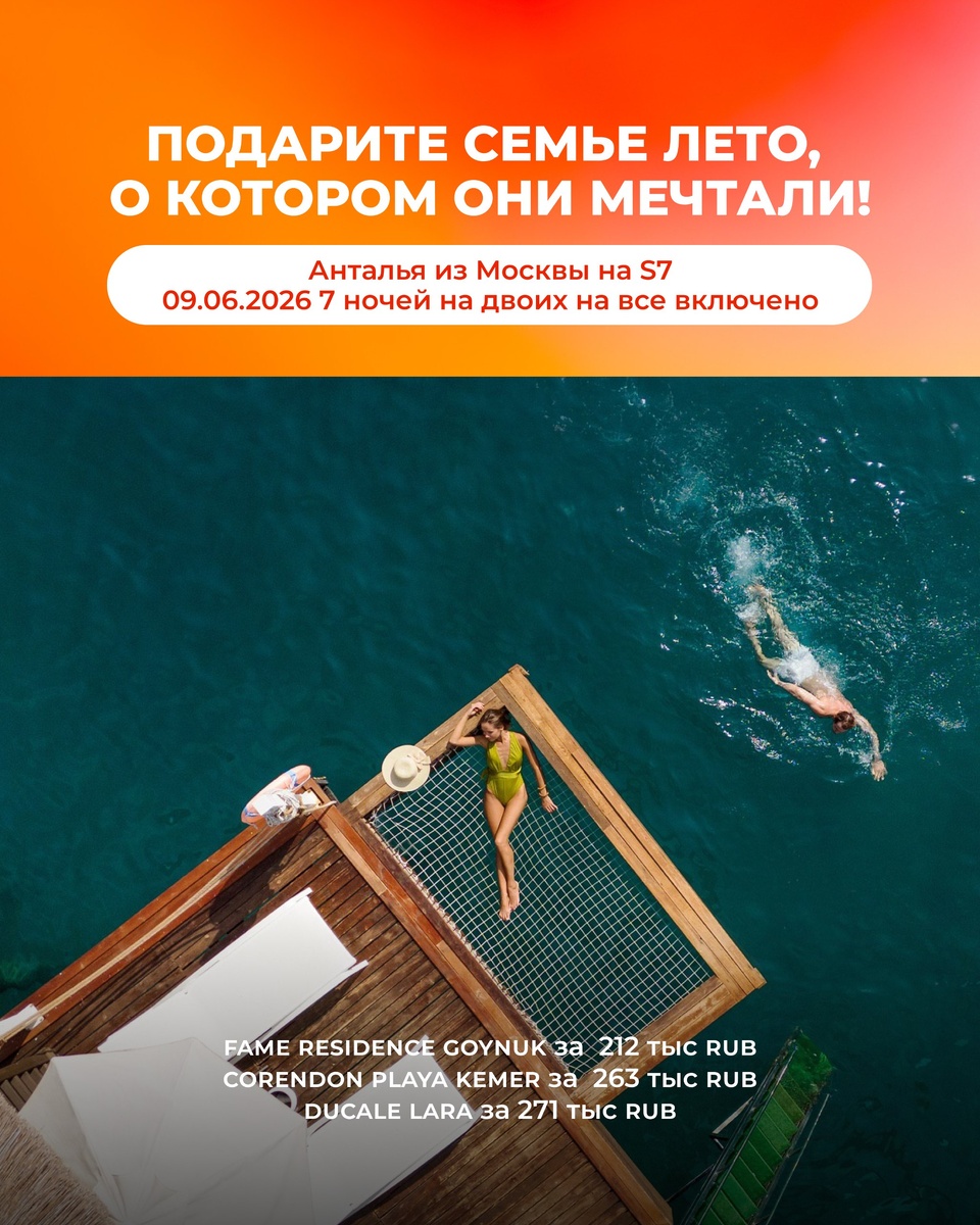 👋 Подарите семье лето, о котором они мечтали! ✈️Анталья из Москвы на S7✈️ 09.06.2026 7 ночей на двоих на все включено 🔥Подборка любимых семейных отелей 💫Dobedan Exclusive за 334 тыс RUB 💫 Ducale Lara за 272 тыс RUB 💫 Corendon Playa за Kemer за 264 тыс RUB 💫 Porto Bello Hotel Resort & Spa за 244 тыс RUB 💫 Fame Residence Goynuk за 212 тыс RUB 🧡 Перейдите, пожалуйста, по ссылке, чтобы рассмотреть варианты Вашего отдыха: https://qui-quo.ru/AF02-YH46 Вопросы/ответы сюда👇 https://t.me/KomarovaLarisa Ваш 😍❤️ Тревел Эксперт Лариса Комарова МЫ В МАХ ПРИСОЕДИНЯЙТЕСЬ НАШ САЙТ https://easytravelagency.ru/ Запрещенка https://www.instagram.com/l.komarova1?igsh=aWdkc3VuZH