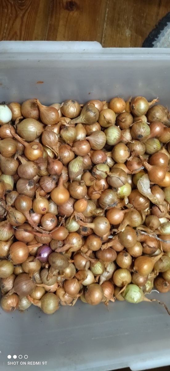 Вытащили лук репчатый и лук севок, чеснок, чтобы перебрать. Севок положить к батарее на прогревание до посадки, чтобы он не стрелковался! Чеснок и лук на еду. А если есть проросшие, то на посадку в теплице!