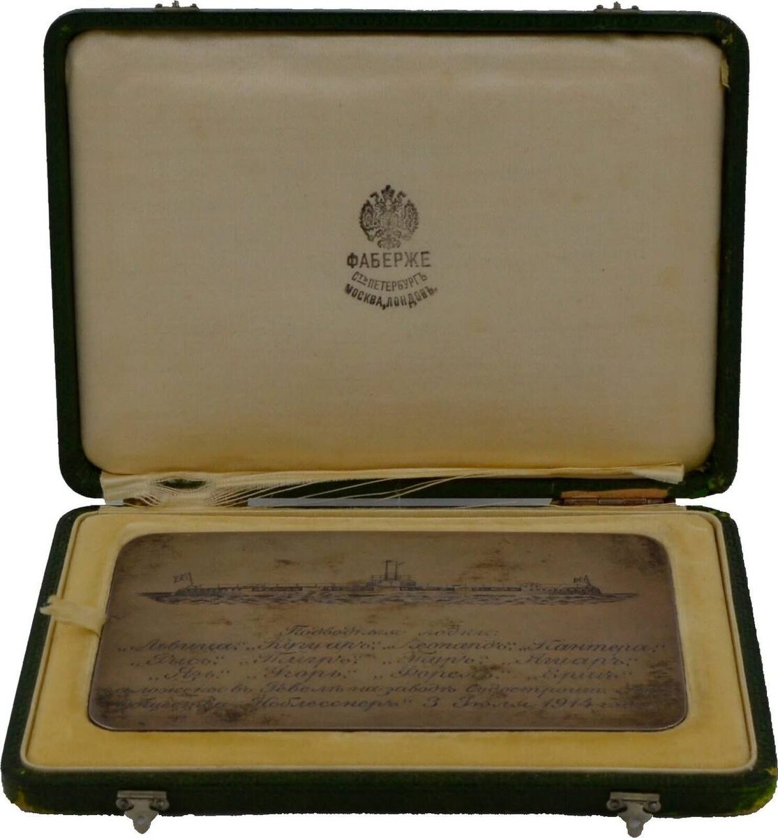 В продаже появился редчайший предмет: серебряная плакетка 1914 года работы фирмы Фаберже, посвящённая закладке подводных лодок на верфи акционерного общества «Ноблесснер» в Ревеле - нынешнем Таллине. На берегу Финского залива незадолго до Первой мировой войны была построена одна из самых современных судостроительных верфей Российской империи. 3 июля 1914 года здесь заложили сразу двенадцать подводных лодок - и их названия выгравированы прямо на плакетке: «Львица», «Кугуар», «Леопард», «Пантера», «Рысь», «Тигр», «Тур», «Ягуар», «Язь», «Коготь», «Форель», «Ёрш». На оборотной стороне перечислены руководители Морского министерства и участники проекта - в том числе вице-адмирал Иван Бубнов, один из основателей российского подводного флота. Плакетка выполнена из серебра, размером 67,7 × 107,5 мм, весом около 82 граммов. Сохранился оригинальный зелёный футляр Фаберже. Цена на аукционе антикварного магазина MA-Shop - 19 995 евро. Предмет объединяет сразу несколько пересекающихся историй: ро