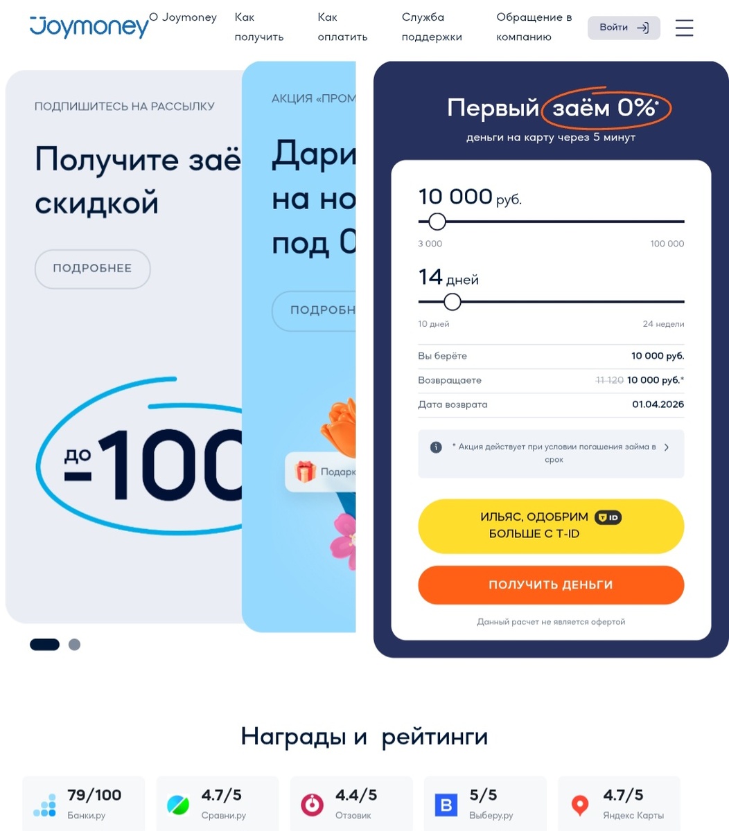 Личное мнение: Joy.Money — это одна из самых клиентоориентированных МФО на рынке сегодня. 97% положительных отзывов по всем ключевым параметрам говорят сами за себя. Здесь реально заботятся о клиентах: помогают с выбором способов оплаты, идут навстречу при временных трудностях и не прячут подводные камни в договорах. Рекомендую как надежный вариант для экстренной финансовой помощи.