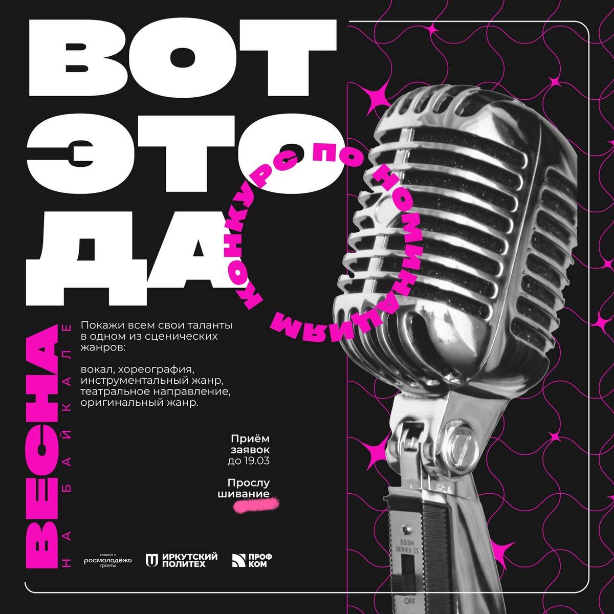 📆 Мы решили не торопить события, чтобы вы смогли еще лучше подготовить свои номера, отточить движения и настроить голоса. Ждем вас немного позже, но с той же энергией и настроем! 📅 24 марта ⌛13:30 📍Актовый зал Иркутского политеха Подавай заявку до 19.03 по ссылке 🔗 Проект реализуется при поддержке Федерального агентства по делам молодёжи Росмолодёжь | Росмолодёжь.Гранты #Росмолодёжь #РосмолодёжьГранты 👻 МАХ | 💙 ВК | 📝 ДЗЕН