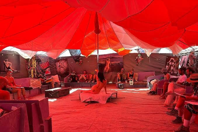 Для тех, кто входит в эти 10%, главным местом силы является Orgy Dome (официальное название лагеря - And Then There Is Only Love). Это не один купол, а серия громадных соединенных тентов с мощными кондиционерами, что критически важно в пустыне. Попасть туда в одиночку мужчине почти невозможно: в лагере действует политика допуска только для пар или групп, чтобы исключить поведение «хищников» или случайных зевак.