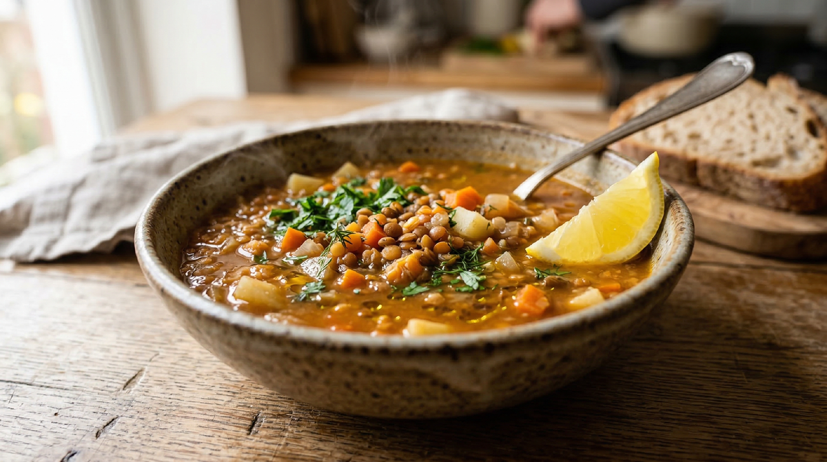 Подаю в глубоких тарелках. Сверху кладу щепотку свежей зелени — петрушку или кинзу, кто что любит. Рядом — ломтик лимона. Лимон выжимается в тарелку по вкусу, и он невероятно хорошо работает с чечевицей, добавляя яркость и свежесть. Ещё можно капнуть немного оливкового масла прямо в тарелку, для аромата и красоты.