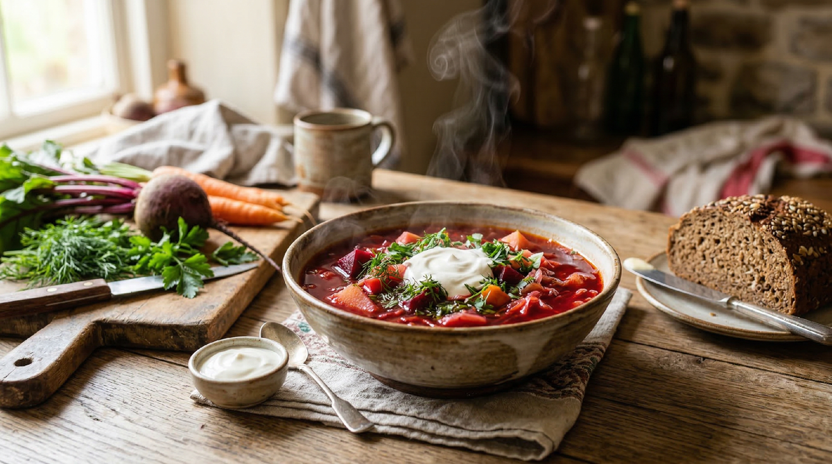 В-третьих, горячий свекольник — идеальное блюдо для переходного сезона. Он не такой тяжёлый, как зимние наваристые щи или солянка, но при этом согревает не хуже. После тарелки свекольника чувствуешь себя сытым, но не перегруженным. Встаёшь из-за стола с ощущением лёгкости — и это именно то, что нужно весной, когда хочется уже сбросить зимнюю тяжесть, но на улице пока ещё не настолько тепло, чтобы перейти на салаты и окрошку.