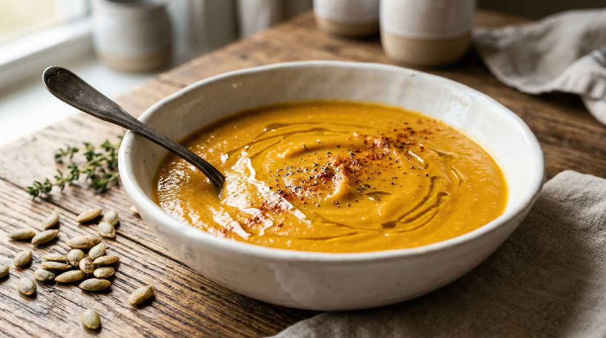 Тыквенный суп-пюре — пожалуй, самый благодарный вариант. Тыква сама по себе даёт сладковатый, мягкий вкус, и чечевица в ней совершенно растворяется. Суп получается густым, ярко-оранжевым, с шелковистой текстурой. Именно с тыквой я впервые попробовала этот метод, и разница с предыдущими попытками была настолько очевидной, что я поняла — обратного пути нет.