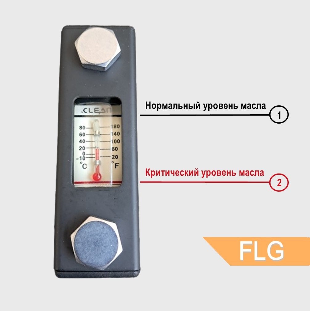 Место установки указателя уровня закладывается еще на этапе проектирования. На шкале указателя имеются две горизонтальных линии - черная 1️⃣ и красная 2️⃣. Черная линия должна соответствовать нормальному уровню заполненного бака, а красная линия - критическому уровню жидкости, ниже которого жидкость опускаться не должна. Расстояние между этими линиями – это допустимый уровень колебания жидкости в баке. В соответствии с этими рекомендациями и выбирается место расположения указателя уровня и его размер. Для определения текущего уровня масла необходимо визуально наблюдать за положением жидкости в смотровом окне относительно нанесенных меток. Если уровень масла находится в пределах между черной и красной линиями (в рабочей зоне), это свидетельствует о нормальном функционировании оборудования. В случае, если уровень опустился до красной линии или ниже, необходима доливка масла во избежание выхода оборудования из строя. Также важно следить, чтобы при заполнении бака уровень не поднимался выш