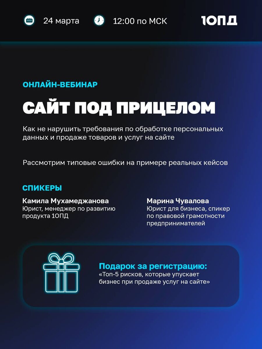 ✔️24 марта в 16:00 проведу бесплатный вебинар вместе с 1ОПД — Первым оператором персональных данных. Сегодня сайт — это не просто витрина бизнеса. Это точка сбора персональных данных клиентов, и именно из-за сайтов компании чаще всего получают претензии от Роскомнадзора и других регуляторов. На вебинаре разберём, какие ошибки на сайте чаще всего становятся причиной проверок и штрафов. Обсудим: ✔️как правильно организовать обработку персональных данных на сайте ✔️как оформить формы сбора данных, чтобы не нарушить закон ✔️какие документы и элементы обязательно должны быть на продающем сайте ✔️типичные ошибки, которые выявляют при проверках ✔️какие нарушения можно исправить быстро, а какие требуют системной работы Отдельно покажем реальные сайты и разберём типичные нарушения на практике. 🎁 За регистрацию вы получите гайд: «Топ-5 рисков, которые бизнес чаще всего упускает при продаже услуг на сайте» 🎁 Участникам вебинара дополнительно подарим чек-лист: «Как оформить формы на сайте
