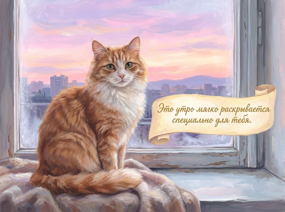 Я — утренний кот, твой маленький хранитель тишины, и сегодня я пришёл напомнить: это утро мягко раскрывается специально для тебя