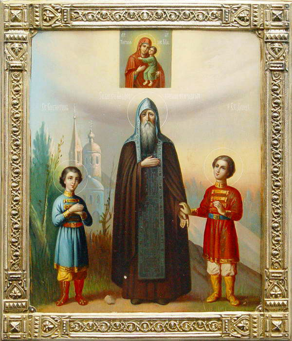 Измла́да яви́стеся святи́и,/ Богому́дре Фео́доре и блаже́нне Дави́де с Константи́ном сла́вным,/ Боже́ственнии сосу́ди, избра́ннии Бо́гови./ Ны́не же источа́ете нам мно́га исцеле́ния от честны́х моще́й ва́ших,/ вся е́реси потопля́юще,/ и спаса́юще при́сно град свой,/ и всех ве́рных сохраня́юще невреди́мо/ от ви́димых и неви́димых враг./ Те́мже ве́рою мо́лим вас, святи́и:/ моли́те Христа́ Бо́га// в ми́ре сохрани́тися нам и спасти́ ду́ши на́ша.