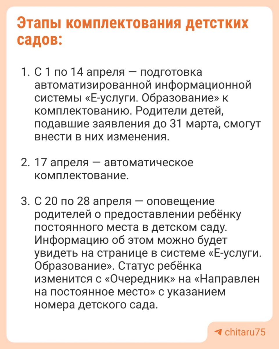 Приём детей будет идти в 5 этапов и продлится до 18 июня, заявления уже можно подавать сейчас. С 17 по 31 марта родители могут поменять данные в системе «Е-услуги. Образование». Для этого нужно написать заявление и подать его в комитет образования мэрии на Забайкальского Рабочего, 94, кабинеты № 208, 213 в рабочие дни с 8.30 до 17.45 (в пятницу до 16.30). Также заявление можно подать в МФЦ на Белика, 12, Бутина, 72, Ярославского, 40 (ежедневно с 9.00 до 18.00, четверг с 9.00 до 20.00). Весной 2025 года мэр Читы Инна Щеглова заявила, что несмотря на сокращение рождаемости в сады и школы приходит все больше детей: Каждый год детей, которые поступают в детский сад и 1-й класс, на 100–200 больше, чем в предыдущем году. Поэтому мы растем. Да, у нас есть определенные проблемы с точки зрения достаточности этих мест, но тем не менее вопрос решается. Не так скоро, как хотелось бы, но решается. 📌📌📌📌📌 «Чита.Ру» в MAX