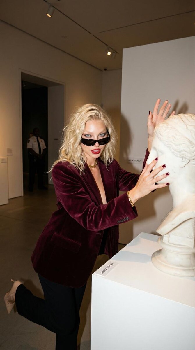📸: ✨ отправь свое фото в бот https://t.me/aibudka_bot (лицо чётко видно) ✨ выбери Nano Banana Pro (обязательно поставь ползунок на pro для топ результата) ✨ параметры: 2K, 9:16 (или любые) ✨ скопируй и вставь этот промпт: Сохрани лицо с загруженного фото. Не меняй лицо. Сходство 100%. Фэшн-снимок в стиле paparazzi night out, формат 9:16. Девушка в пустом ночном музее протягивает руку к белой мраморной скульптуре и касается её лица кончиками пальцев, зеркально повторяя позу скульптуры другой рукой. Провокационная полуулыбка. Бордовый бархатный блейзер оверсайз на голое тело, чёрные брюки, бежевые лодочки, золотая цепочка-чокер, золотой браслет, бордовый лак. Очки Matrix сдвинуты на кончик носа. Красная помада, smoky eyes, волны. Фон — белые стены галереи, точечный свет на скульптуру, табличка «do not touch», охранник размыт в дверном проёме. Музейный свет плюс вспышка, запретный жест.
