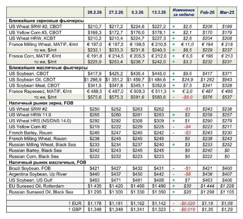 🌾 Делюсь свежими данными по рынку. Сегодня проанализировал текущую ситуацию по фьючерсам и ценам FOB, чтобы вы были в курсе последних изменений. 📊 Начнем с **зерновых фьючерсов**: 🇺🇸 Пшеница SRW на CBOT торгуется по $227,2, а HRW на KCBT — по $227,3. Кукуруза в США стоит $178,1. 🇫🇷 Во Франции на бирже MATIF мукомольная пшеница оценивается в €210,5, а кукуруза — в €212,0. 🌽 Переходим к **масличным фьючерсам**: 🇺🇸 Соя на CBOT — $445,0, соевое масло — $1484,6, а соевый шрот — $352,6. 🇫🇷 Рапс на MATIF показывает отметку €511,3. 🌻 Теперь взглянем на **наличный рынок (FOB)**, где ситуация выглядит следующим образом: 🇺🇸 Пшеница в портах США: SRW — $262, HRW 11.0 — $283, HRS 14.0 — $309. Кукуруза — $225. 🇫🇷 Французский ячмень — $242, мукомольная пшеница — $245. 🇷🇺 Российская пшеница (Черное море) — $240, ячмень — $245, кукуруза — $223. 🚢 #Агрорынок #Зерно #Фьючерсы #СельскоеХозяйство #Аналитика Редакция "Алтай-агро"